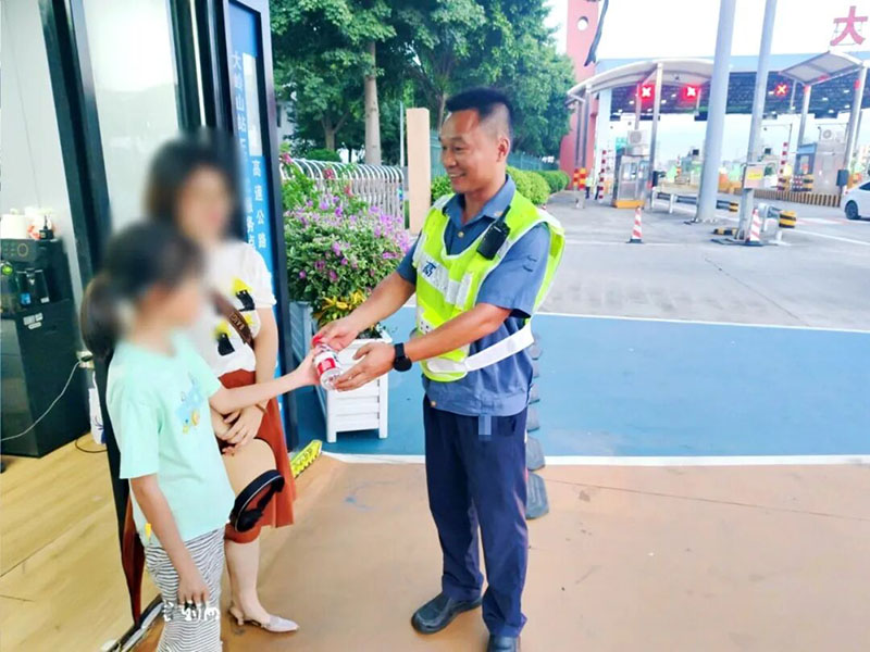 下午5時(shí)30分,何勇釗發(fā)現(xiàn)一位女士帶著小孩在收費(fèi)站旁焦急徘徊。主動(dòng)詢問后得知,女士車輛突發(fā)故障,家屬正趕來但尚未抵達(dá)。"您別急,先過來休息。"他迅速引導(dǎo)她們到ETC服務(wù)亭,遞上礦泉水并安撫道:"大熱天,先喝點(diǎn)水。"隨后一邊幫忙安撫滯留群眾情緒,一邊聯(lián)系家屬,清晰告知最快抵達(dá)路線??粗⒆觽兎潘傻刈谝巫由虾人?,女士緊鎖的眉頭終于逐漸舒展。