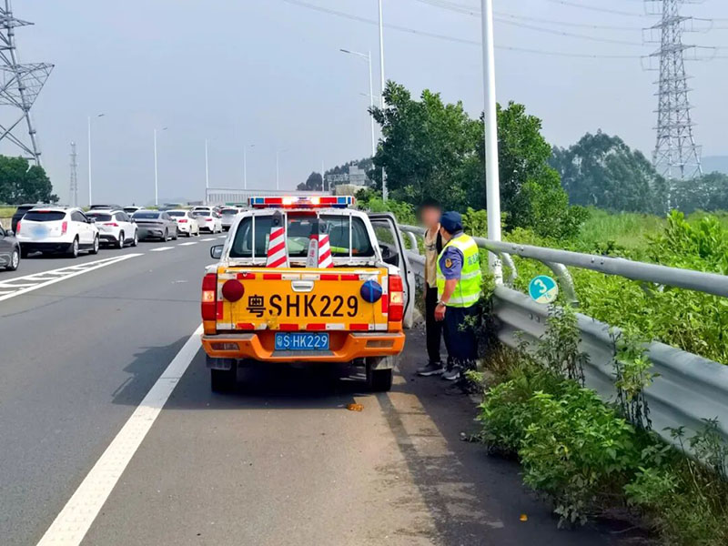 國慶假期莞番高速東行路段車流密集,路政員賴建輝駕駛巡邏車,和副駕駛張志威在執(zhí)行日常巡邏任務(wù)。二人突然發(fā)現(xiàn)右側(cè)應(yīng)急車道護(hù)欄邊,一名背著書包的少年正在高速公路應(yīng)急車道邊緣行走,情形十分危險(xiǎn)。